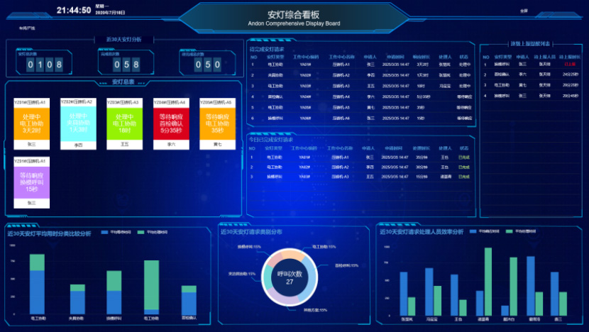 可視化看板提供多維度的安燈數桐分析0包括П近30天安燈事件趨勢分析、安燈平均處理時長統(tǒng)計、安燈類型分布占比、處理人員響應效率評估口以及實時展示當日安燈狀態(tài)與已完成事項明細