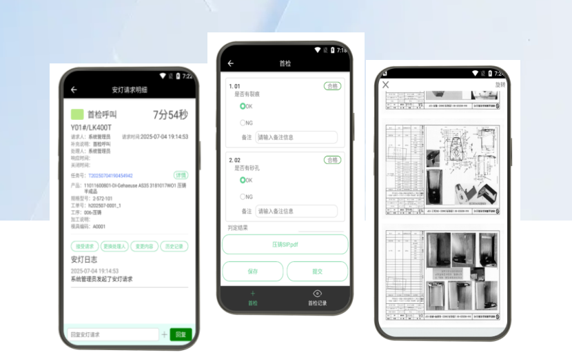當(dāng)任務(wù)首檢觸發(fā)后,安燈管理系統(tǒng)會自動推送首檢任務(wù)至品質(zhì)人員終端。品質(zhì)人員接收任務(wù)后,前往指定機臺執(zhí)行首檢,可通過終端實時查看產(chǎn)品SIP(標(biāo)準(zhǔn)檢驗程序),并支持拍照上傳首檢結(jié)果,最終完成首檢確認(rèn)流程。